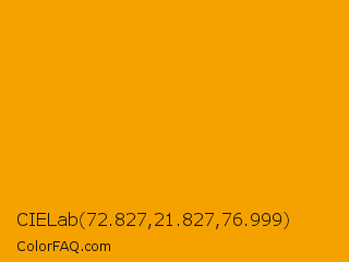 CIELab 72.827,21.827,76.999 Color is a normal orange color and the nearest color is Orange Peel #ffa000. Hex code #f5a100 and RGB value is rgb(245,161,0). In RGB color space, this color is composed of 96% red, 63% green, 0% blue, In CMYK color space, this color is composed of 0% cyan, 34% magenta, 100% yellow , 4% black , In HSL color space, this color has a hue angle of 39° , 100% saturation and 48% lightness.