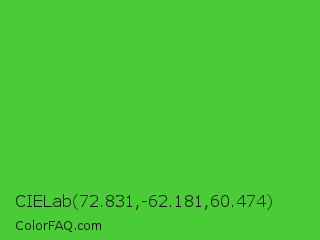 CIELab 72.831,-62.181,60.474 Color is a normal green color and the nearest color is Lime Green #32cd32. Hex code #4acc36 and RGB value is rgb(74,204,54). In RGB color space, this color is composed of 29% red, 80% green, 21% blue, In CMYK color space, this color is composed of 64% cyan, 0% magenta, 74% yellow , 20% black , In HSL color space, this color has a hue angle of 112° , 60% saturation and 51% lightness.