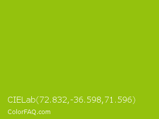 CIELab 72.832,-36.598,71.596 Color is a normal lime color and the nearest color is Pistachio Green #9dc209. Hex code #94c20d and RGB value is rgb(148,194,13). In RGB color space, this color is composed of 58% red, 76% green, 5% blue, In CMYK color space, this color is composed of 24% cyan, 0% magenta, 93% yellow , 24% black , In HSL color space, this color has a hue angle of 75° , 87% saturation and 41% lightness.