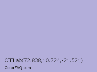 CIELab 72.838,10.724,-21.521 Color is a light indigo color and the nearest color is Maximum Blue Purple #acace6. Hex code #b3aeda and RGB value is rgb(179,174,218). In RGB color space, this color is composed of 70% red, 68% green, 85% blue, In CMYK color space, this color is composed of 18% cyan, 20% magenta, 0% yellow , 15% black , In HSL color space, this color has a hue angle of 247° , 37% saturation and 77% lightness.