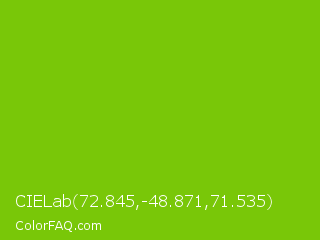 CIELab 72.845,-48.871,71.535 Color is a normal green color and the nearest color is Lima #76bd17. Hex code #79c708 and RGB value is rgb(121,199,8). In RGB color space, this color is composed of 47% red, 78% green, 3% blue, In CMYK color space, this color is composed of 39% cyan, 0% magenta, 96% yellow , 22% black , In HSL color space, this color has a hue angle of 85° , 92% saturation and 41% lightness.