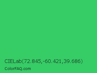 CIELab 72.845,-60.421,39.686 Color is a normal green color and the nearest color is UFO Green #3cd070. Hex code #36cc66 and RGB value is rgb(54,204,102). In RGB color space, this color is composed of 21% red, 80% green, 40% blue, In CMYK color space, this color is composed of 74% cyan, 0% magenta, 50% yellow , 20% black , In HSL color space, this color has a hue angle of 139° , 60% saturation and 51% lightness.
