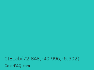 CIELab 72.848,-40.996,-6.302 Color is a normal cyan color and the nearest color is Java #1fc2c2. Hex code #26c7bd and RGB value is rgb(38,199,189). In RGB color space, this color is composed of 15% red, 78% green, 74% blue, In CMYK color space, this color is composed of 81% cyan, 0% magenta, 5% yellow , 22% black , In HSL color space, this color has a hue angle of 176° , 68% saturation and 46% lightness.