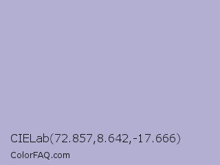 CIELab 72.857,8.642,-17.666 Color is a light indigo color and the nearest color is Logan #aaa9cd. Hex code #b3afd3 and RGB value is rgb(179,175,211). In RGB color space, this color is composed of 70% red, 69% green, 83% blue, In CMYK color space, this color is composed of 15% cyan, 17% magenta, 0% yellow , 17% black , In HSL color space, this color has a hue angle of 247° , 29% saturation and 76% lightness.