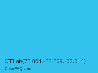 CIELab 72.864,-22.209,-32.314 Color is a normal blue color and the nearest color is Picton Blue #45b1e8. Hex code #33c1ed and RGB value is rgb(51,193,237). In RGB color space, this color is composed of 20% red, 76% green, 93% blue, In CMYK color space, this color is composed of 78% cyan, 19% magenta, 0% yellow , 7% black , In HSL color space, this color has a hue angle of 194° , 84% saturation and 56% lightness.