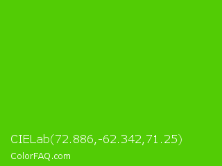 CIELab 72.886,-62.342,71.25 Color is a normal green color and the nearest color is Harlequin Green #46cb18. Hex code #52cc05 and RGB value is rgb(82,204,5). In RGB color space, this color is composed of 32% red, 80% green, 2% blue, In CMYK color space, this color is composed of 60% cyan, 0% magenta, 98% yellow , 20% black , In HSL color space, this color has a hue angle of 97° , 95% saturation and 41% lightness.
