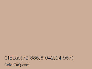 CIELab 72.886,8.042,14.967 Color is a light orange color and the nearest color is Rodeo Dust #c9b29b. Hex code #ccad98 and RGB value is rgb(204,173,152). In RGB color space, this color is composed of 80% red, 68% green, 60% blue, In CMYK color space, this color is composed of 0% cyan, 15% magenta, 25% yellow , 20% black , In HSL color space, this color has a hue angle of 24° , 34% saturation and 70% lightness.