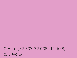 CIELab 72.893,32.098,-11.678 Color is a light magenta color and the nearest color is Kobi #e79fc4. Hex code #e39ec9 and RGB value is rgb(227,158,201). In RGB color space, this color is composed of 89% red, 62% green, 79% blue, In CMYK color space, this color is composed of 0% cyan, 30% magenta, 11% yellow , 11% black , In HSL color space, this color has a hue angle of 323° , 55% saturation and 75% lightness.
