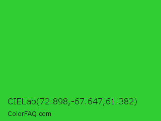 CIELab 72.898,-67.647,61.382 Color is a normal green color and the nearest color is Lime Green #32cd32. Hex code #30ce33 and RGB value is rgb(48,206,51). In RGB color space, this color is composed of 19% red, 81% green, 20% blue, In CMYK color space, this color is composed of 77% cyan, 0% magenta, 75% yellow , 19% black , In HSL color space, this color has a hue angle of 121° , 62% saturation and 50% lightness.