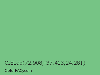 CIELab 72.908,-37.413,24.281 Color is a light green color and the nearest color is De York #7ac488. Hex code #76c485 and RGB value is rgb(118,196,133). In RGB color space, this color is composed of 46% red, 77% green, 52% blue, In CMYK color space, this color is composed of 40% cyan, 0% magenta, 32% yellow , 23% black , In HSL color space, this color has a hue angle of 132° , 40% saturation and 62% lightness.