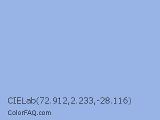 CIELab 72.912,2.233,-28.116 Color is a light blue color and the nearest color is Pale Cerulean #9bc4e2. Hex code #98b4e6 and RGB value is rgb(152,180,230). In RGB color space, this color is composed of 60% red, 71% green, 90% blue, In CMYK color space, this color is composed of 34% cyan, 22% magenta, 0% yellow , 10% black , In HSL color space, this color has a hue angle of 218° , 61% saturation and 75% lightness.