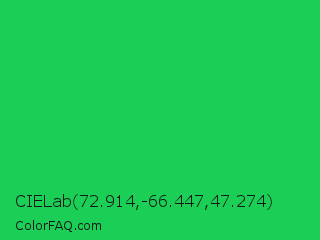 CIELab 72.914,-66.447,47.274 Color is a normal green color and the nearest color is Malachite #0bda51. Hex code #1ace56 and RGB value is rgb(26,206,86). In RGB color space, this color is composed of 10% red, 81% green, 34% blue, In CMYK color space, this color is composed of 87% cyan, 0% magenta, 58% yellow , 19% black , In HSL color space, this color has a hue angle of 140° , 78% saturation and 45% lightness.