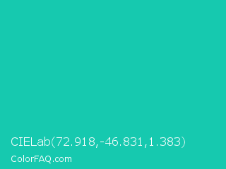 CIELab 72.918,-46.831,1.383 Color is a normal cyan color and the nearest color is Tiffany Blue #0abab5. Hex code #16c9af and RGB value is rgb(22,201,175). In RGB color space, this color is composed of 9% red, 79% green, 69% blue, In CMYK color space, this color is composed of 89% cyan, 0% magenta, 13% yellow , 21% black , In HSL color space, this color has a hue angle of 171° , 80% saturation and 44% lightness.