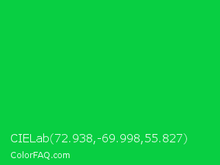 CIELab 72.938,-69.998,55.827 Color is a normal green color and the nearest color is Dark Pastel Green #03c03c. Hex code #08cf42 and RGB value is rgb(8,207,66). In RGB color space, this color is composed of 3% red, 81% green, 26% blue, In CMYK color space, this color is composed of 96% cyan, 0% magenta, 68% yellow , 19% black , In HSL color space, this color has a hue angle of 137° , 93% saturation and 42% lightness.