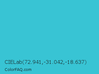 CIELab 72.941,-31.042,-18.637 Color is a normal cyan color and the nearest color is Scooter #2ebfd4. Hex code #38c4d4 and RGB value is rgb(56,196,212). In RGB color space, this color is composed of 22% red, 77% green, 83% blue, In CMYK color space, this color is composed of 74% cyan, 8% magenta, 0% yellow , 17% black , In HSL color space, this color has a hue angle of 186° , 64% saturation and 53% lightness.