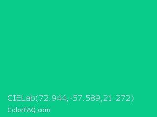 CIELab 72.944,-57.589,21.272 Color is a normal green color and the nearest color is Caribbean Green #00cc99. Hex code #09cc8a and RGB value is rgb(9,204,138). In RGB color space, this color is composed of 4% red, 80% green, 54% blue, In CMYK color space, this color is composed of 96% cyan, 0% magenta, 32% yellow , 20% black , In HSL color space, this color has a hue angle of 160° , 92% saturation and 42% lightness.