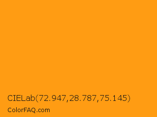 CIELab 72.947,28.787,75.145 Color is a normal orange color and the nearest color is Tree Poppy #fc9c1d. Hex code #ff9c13 and RGB value is rgb(255,156,19). In RGB color space, this color is composed of 100% red, 61% green, 7% blue, In CMYK color space, this color is composed of 0% cyan, 39% magenta, 93% yellow , 0% black , In HSL color space, this color has a hue angle of 35° , 100% saturation and 54% lightness.