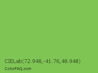 CIELab 72.948,-41.76,48.948 Color is a normal green color and the nearest color is Bud Green #7bb661. Hex code #7fc554 and RGB value is rgb(127,197,84). In RGB color space, this color is composed of 50% red, 77% green, 33% blue, In CMYK color space, this color is composed of 36% cyan, 0% magenta, 57% yellow , 23% black , In HSL color space, this color has a hue angle of 97° , 49% saturation and 55% lightness.