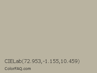 CIELab 72.953,-1.155,10.459 Color is a light yellow color and the nearest color is Nomad #bab1a2. Hex code #b9b3a0 and RGB value is rgb(185,179,160). In RGB color space, this color is composed of 73% red, 70% green, 63% blue, In CMYK color space, this color is composed of 0% cyan, 3% magenta, 14% yellow , 27% black , In HSL color space, this color has a hue angle of 46° , 15% saturation and 68% lightness.