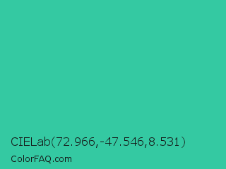 CIELab 72.966,-47.546,8.531 Color is a normal cyan color and the nearest color is Shamrock #33cc99. Hex code #34c9a2 and RGB value is rgb(52,201,162). In RGB color space, this color is composed of 20% red, 79% green, 64% blue, In CMYK color space, this color is composed of 74% cyan, 0% magenta, 19% yellow , 21% black , In HSL color space, this color has a hue angle of 164° , 59% saturation and 50% lightness.