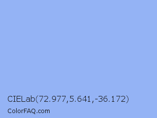 CIELab 72.977,5.641,-36.172 Color is a light blue color and the nearest color is Jordy Blue #8ab9f1. Hex code #94b3f5 and RGB value is rgb(148,179,245). In RGB color space, this color is composed of 58% red, 70% green, 96% blue, In CMYK color space, this color is composed of 40% cyan, 27% magenta, 0% yellow , 4% black , In HSL color space, this color has a hue angle of 221° , 83% saturation and 77% lightness.