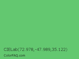 CIELab 72.978,-47.989,35.122 Color is a normal green color and the nearest color is Fern #63b76c. Hex code #63c870 and RGB value is rgb(99,200,112). In RGB color space, this color is composed of 39% red, 78% green, 44% blue, In CMYK color space, this color is composed of 51% cyan, 0% magenta, 44% yellow , 22% black , In HSL color space, this color has a hue angle of 128° , 48% saturation and 59% lightness.