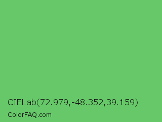 CIELab 72.979,-48.352,39.159 Color is a normal green color and the nearest color is Mantis #74c365. Hex code #66c868 and RGB value is rgb(102,200,104). In RGB color space, this color is composed of 40% red, 78% green, 41% blue, In CMYK color space, this color is composed of 49% cyan, 0% magenta, 48% yellow , 22% black , In HSL color space, this color has a hue angle of 121° , 47% saturation and 59% lightness.