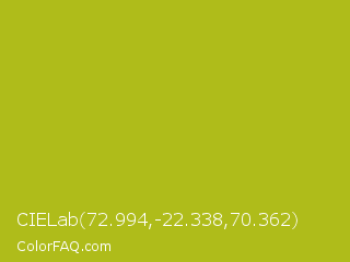 CIELab 72.994,-22.338,70.362 Color is a normal yellow color and the nearest color is Acid Green #b0bf1a. Hex code #afbc1a and RGB value is rgb(175,188,26). In RGB color space, this color is composed of 69% red, 74% green, 10% blue, In CMYK color space, this color is composed of 7% cyan, 0% magenta, 86% yellow , 26% black , In HSL color space, this color has a hue angle of 65° , 76% saturation and 42% lightness.