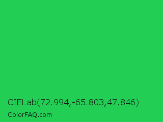 CIELab 72.994,-65.803,47.846 Color is a normal green color and the nearest color is Malachite #0bda51. Hex code #23ce55 and RGB value is rgb(35,206,85). In RGB color space, this color is composed of 14% red, 81% green, 33% blue, In CMYK color space, this color is composed of 83% cyan, 0% magenta, 59% yellow , 19% black , In HSL color space, this color has a hue angle of 138° , 71% saturation and 47% lightness.
