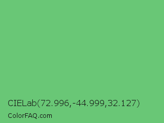 CIELab 72.996,-44.999,32.127 Color is a normal green color and the nearest color is Iguana Green #71bc78. Hex code #69c776 and RGB value is rgb(105,199,118). In RGB color space, this color is composed of 41% red, 78% green, 46% blue, In CMYK color space, this color is composed of 47% cyan, 0% magenta, 41% yellow , 22% black , In HSL color space, this color has a hue angle of 128° , 46% saturation and 60% lightness.