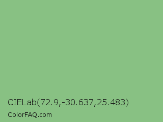 CIELab 72.9,-30.637,25.483 Color is a light green color and the nearest color is Dark Sea Green #8fbc8f. Hex code #88c183 and RGB value is rgb(136,193,131). In RGB color space, this color is composed of 53% red, 76% green, 51% blue, In CMYK color space, this color is composed of 30% cyan, 0% magenta, 32% yellow , 24% black , In HSL color space, this color has a hue angle of 115° , 33% saturation and 64% lightness.