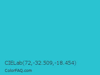 CIELab 72,-32.509,-18.454 Color is a normal cyan color and the nearest color is Scooter #2ebfd4. Hex code #29c2d1 and RGB value is rgb(41,194,209). In RGB color space, this color is composed of 16% red, 76% green, 82% blue, In CMYK color space, this color is composed of 80% cyan, 7% magenta, 0% yellow , 18% black , In HSL color space, this color has a hue angle of 185° , 67% saturation and 49% lightness.