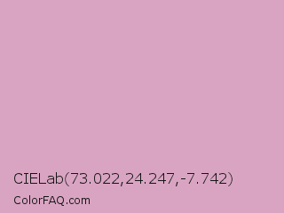 CIELab 73.022,24.247,-7.742 Color is a light magenta color and the nearest color is Light Medium Orchid #d39bcb. Hex code #d9a4c2 and RGB value is rgb(217,164,194). In RGB color space, this color is composed of 85% red, 64% green, 76% blue, In CMYK color space, this color is composed of 0% cyan, 24% magenta, 11% yellow , 15% black , In HSL color space, this color has a hue angle of 326° , 41% saturation and 75% lightness.
