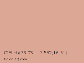 CIELab 73.031,17.552,16.51 Color is a light red color and the nearest color is Pastel Pink #dea5a4. Hex code #dda796 and RGB value is rgb(221,167,150). In RGB color space, this color is composed of 87% red, 65% green, 59% blue, In CMYK color space, this color is composed of 0% cyan, 24% magenta, 32% yellow , 13% black , In HSL color space, this color has a hue angle of 14° , 51% saturation and 73% lightness.