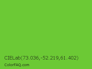 CIELab 73.036,-52.219,61.402 Color is a normal green color and the nearest color is Green RYB #66b032. Hex code #6cc935 and RGB value is rgb(108,201,53). In RGB color space, this color is composed of 42% red, 79% green, 21% blue, In CMYK color space, this color is composed of 46% cyan, 0% magenta, 74% yellow , 21% black , In HSL color space, this color has a hue angle of 98° , 58% saturation and 50% lightness.
