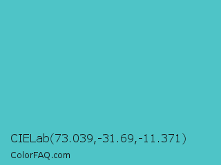 CIELab 73.039,-31.69,-11.371 Color is a normal cyan color and the nearest color is Sea Serpent #4bc7cf. Hex code #4ec4c7 and RGB value is rgb(78,196,199). In RGB color space, this color is composed of 31% red, 77% green, 78% blue, In CMYK color space, this color is composed of 61% cyan, 2% magenta, 0% yellow , 22% black , In HSL color space, this color has a hue angle of 181° , 52% saturation and 54% lightness.