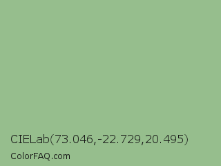 CIELab 73.046,-22.729,20.495 Color is a light green color and the nearest color is Dark Sea Green #8fbc8f. Hex code #96be8d and RGB value is rgb(150,190,141). In RGB color space, this color is composed of 59% red, 75% green, 55% blue, In CMYK color space, this color is composed of 21% cyan, 0% magenta, 26% yellow , 25% black , In HSL color space, this color has a hue angle of 109° , 27% saturation and 65% lightness.