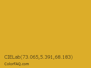 CIELab 73.065,5.391,68.183 Color is a normal orange color and the nearest color is Urobilin #e1ad21. Hex code #dcad29 and RGB value is rgb(220,173,41). In RGB color space, this color is composed of 86% red, 68% green, 16% blue, In CMYK color space, this color is composed of 0% cyan, 21% magenta, 81% yellow , 14% black , In HSL color space, this color has a hue angle of 44° , 72% saturation and 51% lightness.