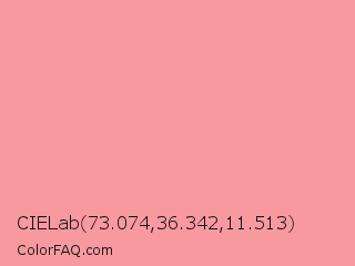 CIELab 73.074,36.342,11.513 Color is a light red color and the nearest color is Sweet Pink #fd9fa2. Hex code #f899a0 and RGB value is rgb(248,153,160). In RGB color space, this color is composed of 97% red, 60% green, 63% blue, In CMYK color space, this color is composed of 0% cyan, 38% magenta, 35% yellow , 3% black , In HSL color space, this color has a hue angle of 356° , 87% saturation and 79% lightness.