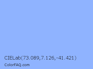 CIELab 73.089,7.126,-41.421 Color is a light blue color and the nearest color is Jordy Blue #8ab9f1. Hex code #8fb3ff and RGB value is rgb(143,179,255). In RGB color space, this color is composed of 56% red, 70% green, 100% blue, In CMYK color space, this color is composed of 44% cyan, 30% magenta, 0% yellow , 0% black , In HSL color space, this color has a hue angle of 221° , 100% saturation and 78% lightness.