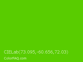 CIELab 73.095,-60.656,72.03 Color is a normal green color and the nearest color is Harlequin Green #46cb18. Hex code #59cc00 and RGB value is rgb(89,204,0). In RGB color space, this color is composed of 35% red, 80% green, 0% blue, In CMYK color space, this color is composed of 56% cyan, 0% magenta, 100% yellow , 20% black , In HSL color space, this color has a hue angle of 94° , 100% saturation and 40% lightness.