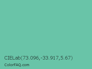 CIELab 73.096,-33.917,5.67 Color is a normal green color and the nearest color is Tradewind #5fb3ac. Hex code #69c4a8 and RGB value is rgb(105,196,168). In RGB color space, this color is composed of 41% red, 77% green, 66% blue, In CMYK color space, this color is composed of 46% cyan, 0% magenta, 14% yellow , 23% black , In HSL color space, this color has a hue angle of 162° , 44% saturation and 59% lightness.