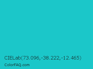 CIELab 73.096,-38.222,-12.465 Color is a normal cyan color and the nearest color is Java #1fc2c2. Hex code #1cc7c9 and RGB value is rgb(28,199,201). In RGB color space, this color is composed of 11% red, 78% green, 79% blue, In CMYK color space, this color is composed of 86% cyan, 1% magenta, 0% yellow , 21% black , In HSL color space, this color has a hue angle of 181° , 76% saturation and 45% lightness.