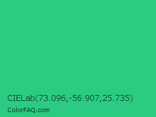 CIELab 73.096,-56.907,25.735 Color is a normal green color and the nearest color is Mountain Meadow #30ba8f. Hex code #2bcc82 and RGB value is rgb(43,204,130). In RGB color space, this color is composed of 17% red, 80% green, 51% blue, In CMYK color space, this color is composed of 79% cyan, 0% magenta, 36% yellow , 20% black , In HSL color space, this color has a hue angle of 152° , 65% saturation and 48% lightness.