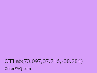 CIELab 73.097,37.716,-38.284 Color is a light purple color and the nearest color is Pale Violet #cc99ff. Hex code #d69dfa and RGB value is rgb(214,157,250). In RGB color space, this color is composed of 84% red, 62% green, 98% blue, In CMYK color space, this color is composed of 14% cyan, 37% magenta, 0% yellow , 2% black , In HSL color space, this color has a hue angle of 277° , 90% saturation and 80% lightness.
