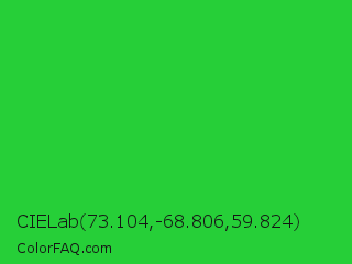 CIELab 73.104,-68.806,59.824 Color is a normal green color and the nearest color is Lime Green #32cd32. Hex code #26cf38 and RGB value is rgb(38,207,56). In RGB color space, this color is composed of 15% red, 81% green, 22% blue, In CMYK color space, this color is composed of 82% cyan, 0% magenta, 73% yellow , 19% black , In HSL color space, this color has a hue angle of 126° , 69% saturation and 48% lightness.