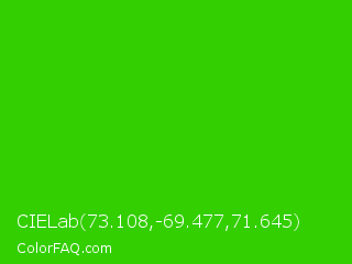 CIELab 73.108,-69.477,71.645 Color is a normal green color and the nearest color is Harlequin Green #46cb18. Hex code #33cf00 and RGB value is rgb(51,207,0). In RGB color space, this color is composed of 20% red, 81% green, 0% blue, In CMYK color space, this color is composed of 75% cyan, 0% magenta, 100% yellow , 19% black , In HSL color space, this color has a hue angle of 105° , 100% saturation and 41% lightness.