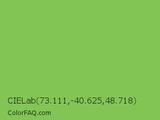 CIELab 73.111,-40.625,48.718 Color is a normal green color and the nearest color is Dollar Bill #85bb65. Hex code #82c555 and RGB value is rgb(130,197,85). In RGB color space, this color is composed of 51% red, 77% green, 33% blue, In CMYK color space, this color is composed of 34% cyan, 0% magenta, 57% yellow , 23% black , In HSL color space, this color has a hue angle of 96° , 49% saturation and 55% lightness.