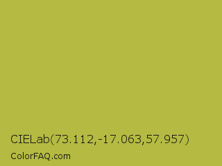 CIELab 73.112,-17.063,57.957 Color is a normal yellow color and the nearest color is Brass #b5a642. Hex code #b5ba42 and RGB value is rgb(181,186,66). In RGB color space, this color is composed of 71% red, 73% green, 26% blue, In CMYK color space, this color is composed of 3% cyan, 0% magenta, 65% yellow , 27% black , In HSL color space, this color has a hue angle of 63° , 48% saturation and 49% lightness.