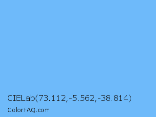 CIELab 73.112,-5.562,-38.814 Color is a light blue color and the nearest color is Very Light Azure #74bbfb. Hex code #6ebafa and RGB value is rgb(110,186,250). In RGB color space, this color is composed of 43% red, 73% green, 98% blue, In CMYK color space, this color is composed of 56% cyan, 26% magenta, 0% yellow , 2% black , In HSL color space, this color has a hue angle of 207° , 93% saturation and 71% lightness.